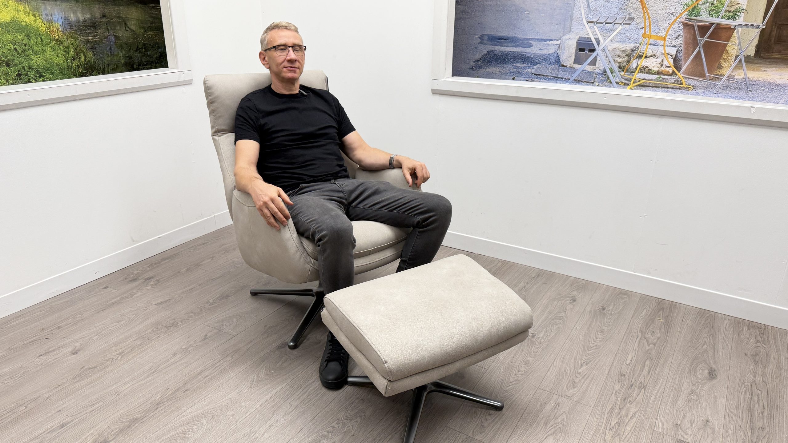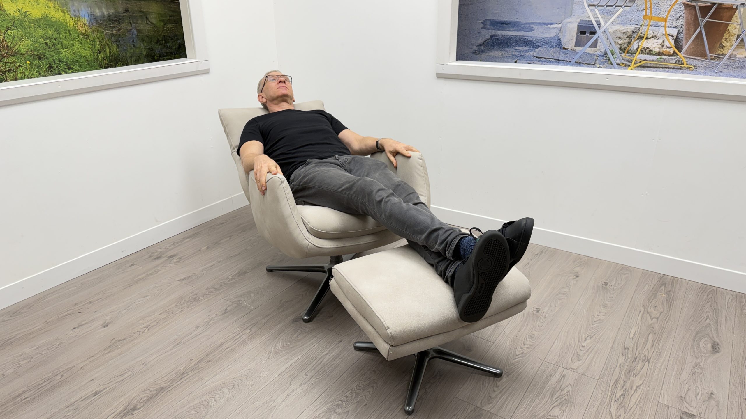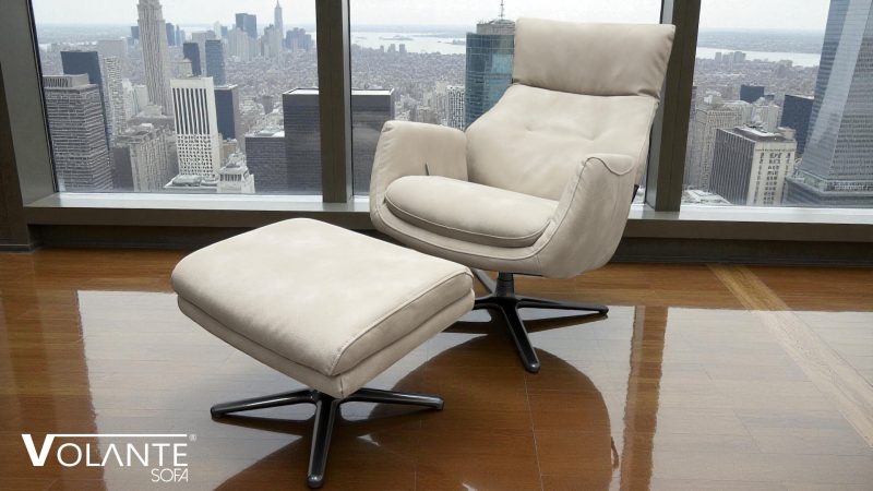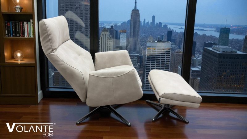 - Exceptional comfort with reclining backrest and matching footstool for full body support and relaxation.
