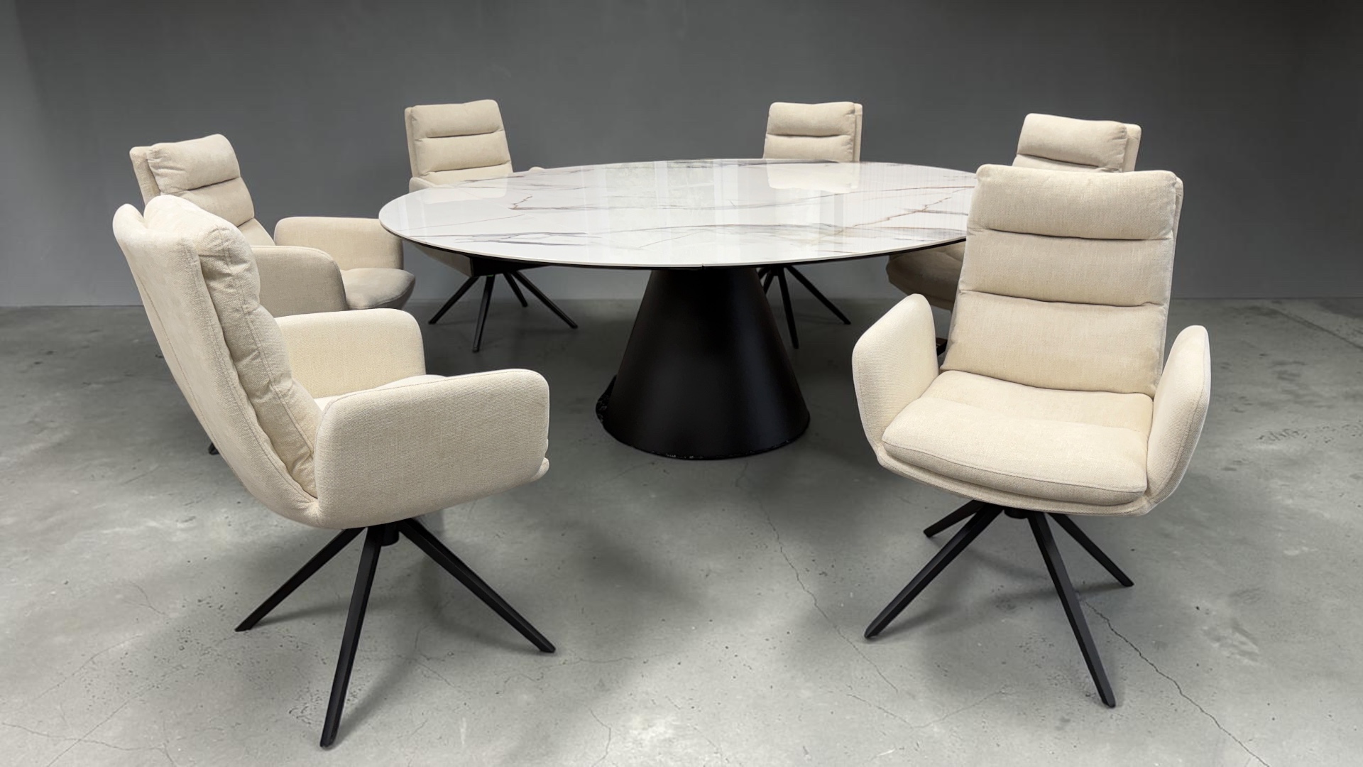 Included with the table are five matching Akante beige swivel dining chairs. These are wide, well padded and engineered for comfort, with supportive arms, a soft fabric finish and a 180 degree pivoting seat. They are not ordinary dining chairs. They feel more like small lounge chairs around a dining table, giving the set a much more relaxed and luxurious feel.