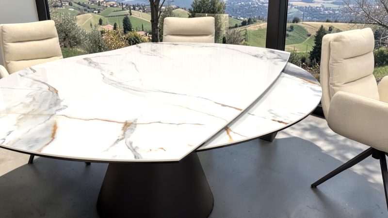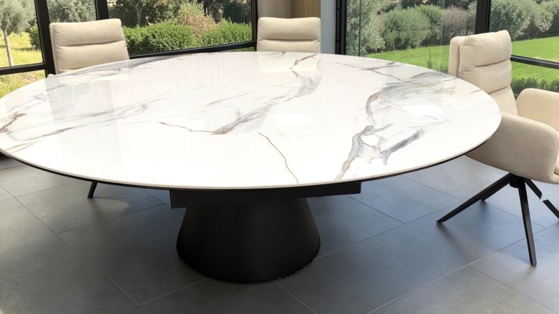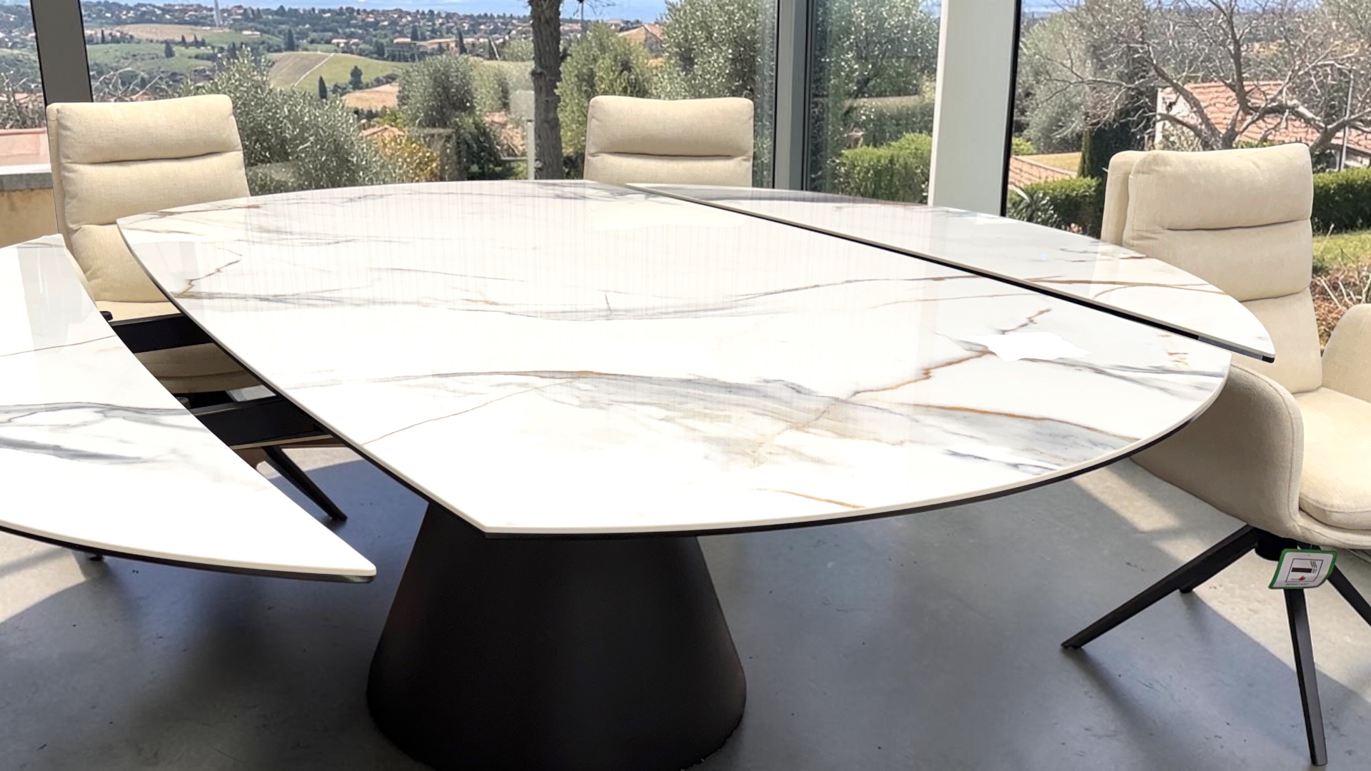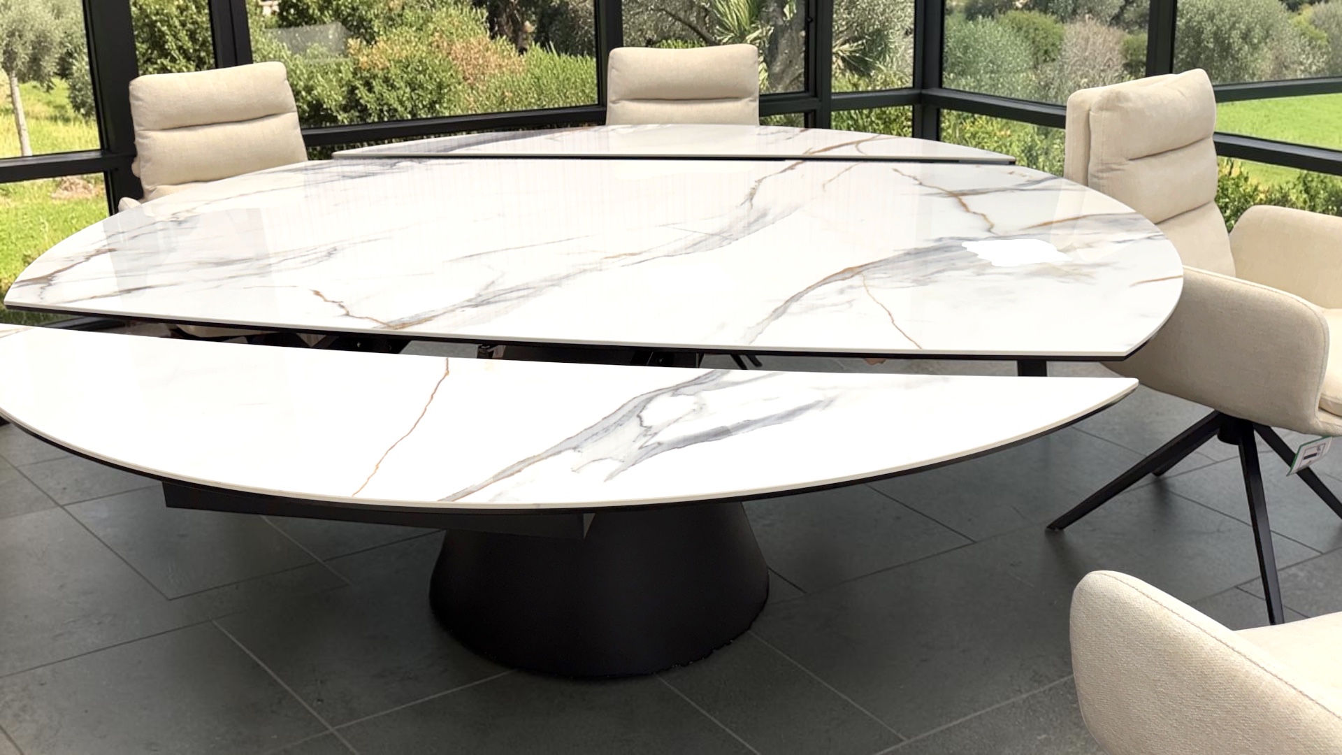 The centrepiece is the Grande Ajaccio style swivel dining table, finished with a glossy Doro marble effect ceramic top. Closed, it gives you a large rounded rectangular dining table with a soft boat shaped profile. Opened, the top swivels around with a synchronised mechanism and transforms into a huge round dining table, creating a dramatic centrepiece for entertaining.