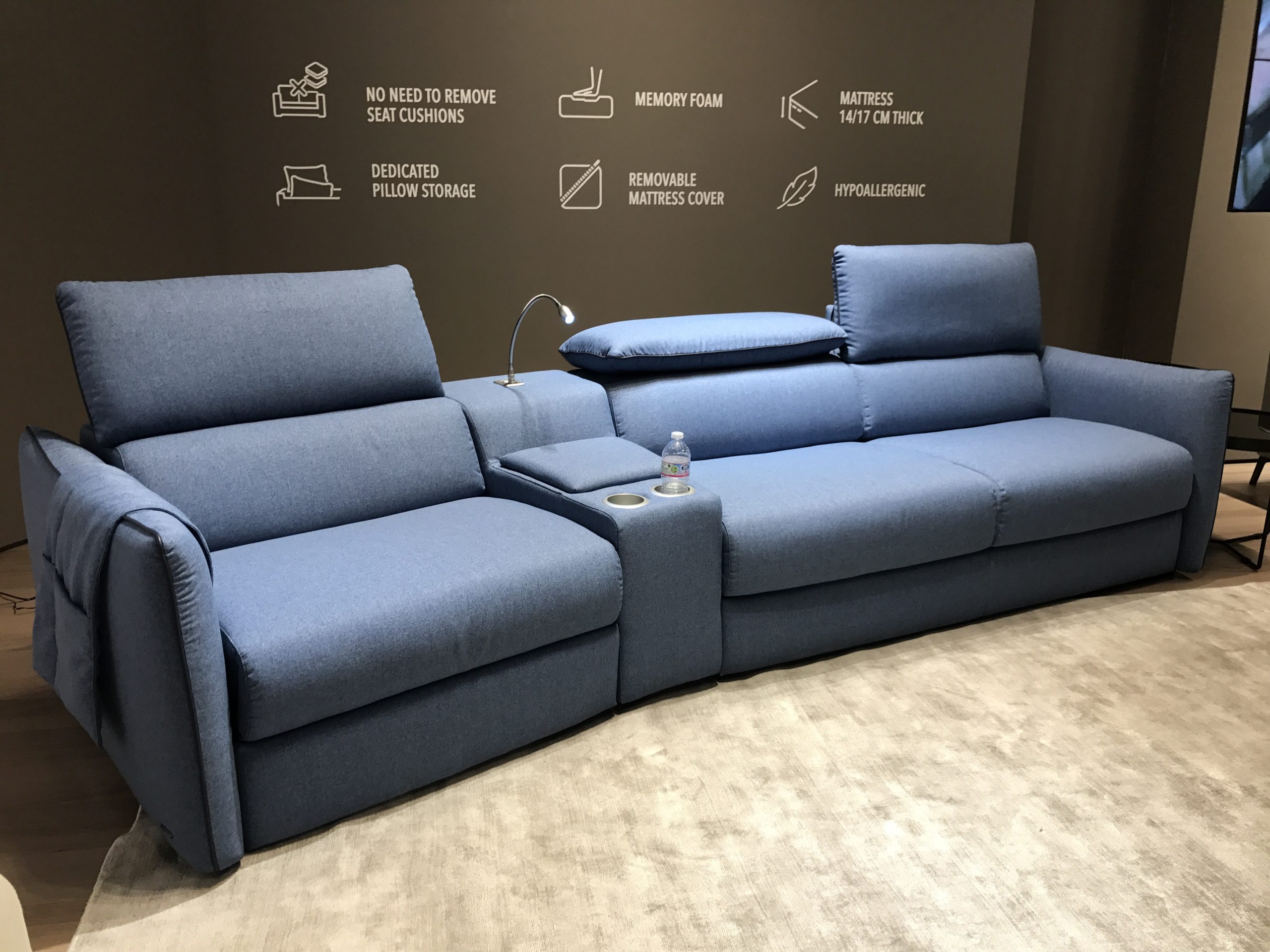 The availability of a roll forward sofa bed which transformes into a full-size bed within five seconds, featuring a thick Italian foam mattress and excellent comfort makes this set very popular as a lounge comfort station that is also then as a spare bedroom.