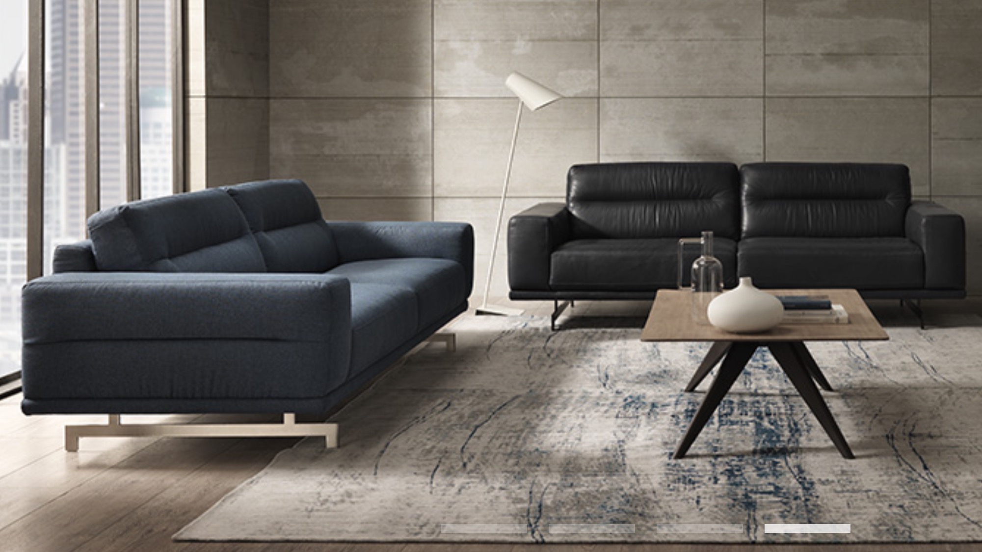 Unveiled for 2017 at the furniture design fair in Cologne this model Natuzzi C018 EZIO Features off the floor styling with an ice skate style leg system, square arms with side detail and minimalist style. Selecting different leathers and fabrics changes the total character of the C018 Ezio from a rustic meets modern sofa, using natural leather or for example or a solid grey colour giving it a very urban and now look. Personally seeing this sofa in a marine aqua teal blue colour fabric drove us to select this for our display model at Furnimax.