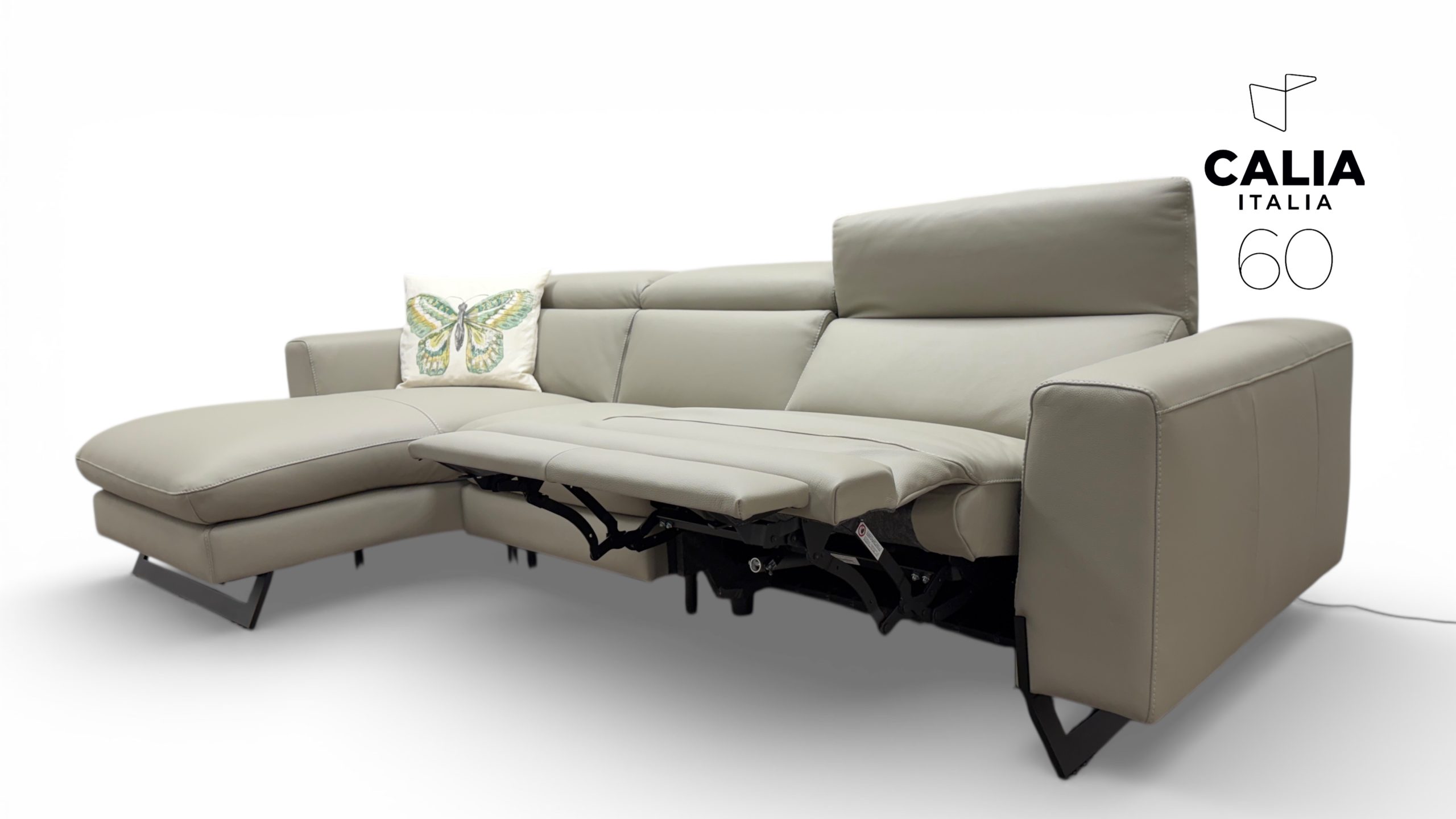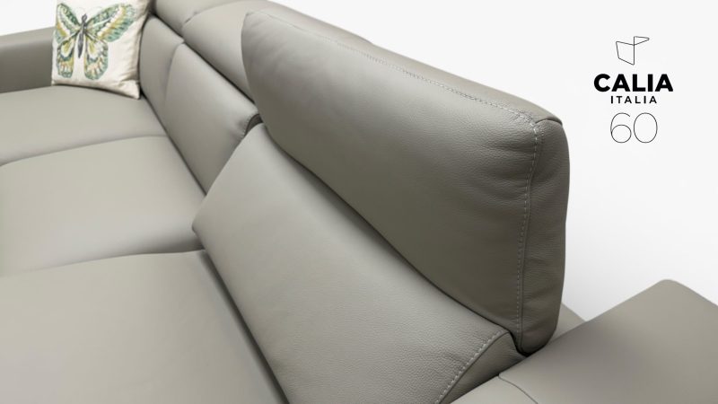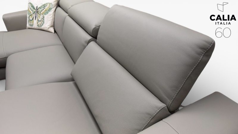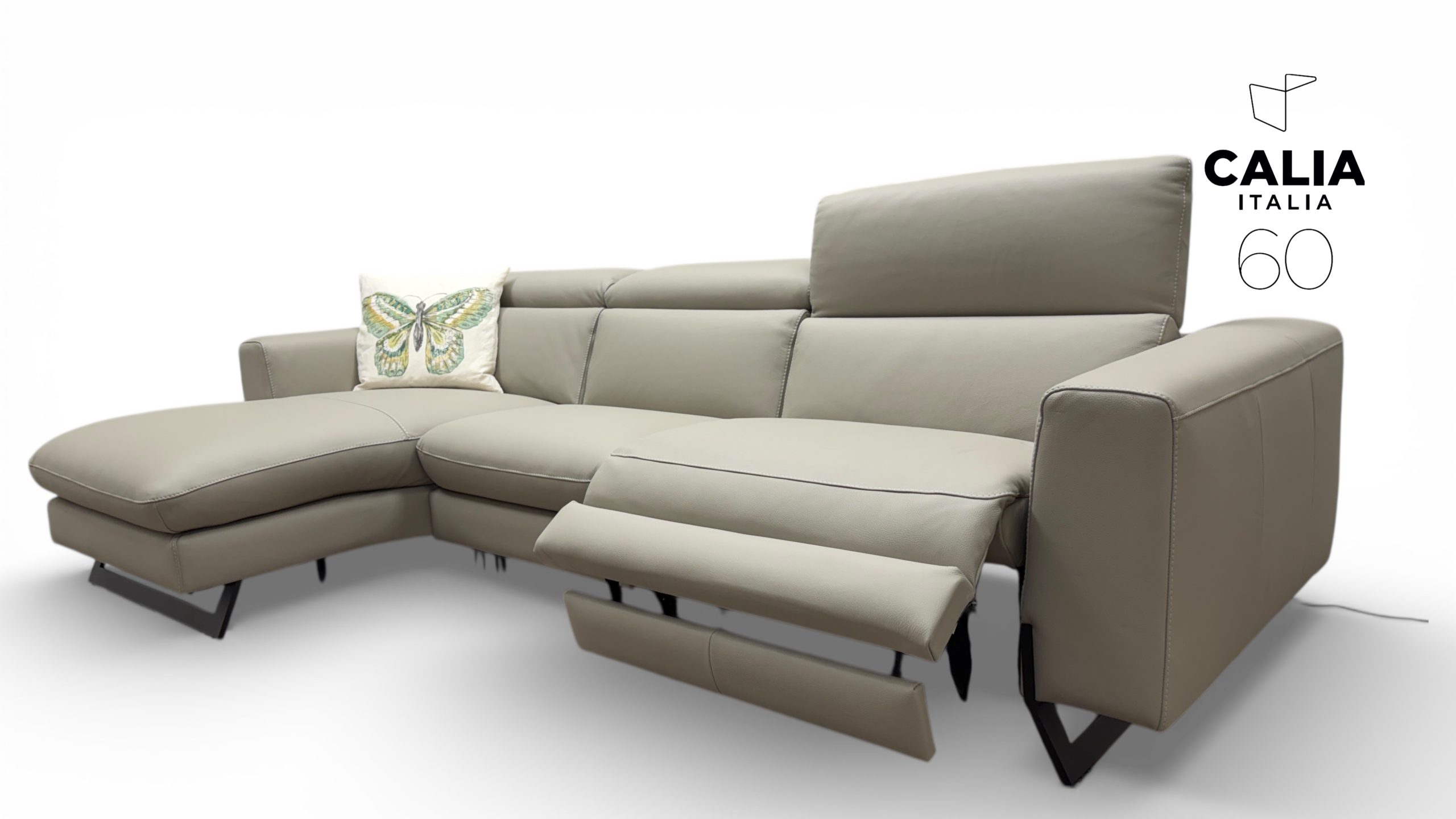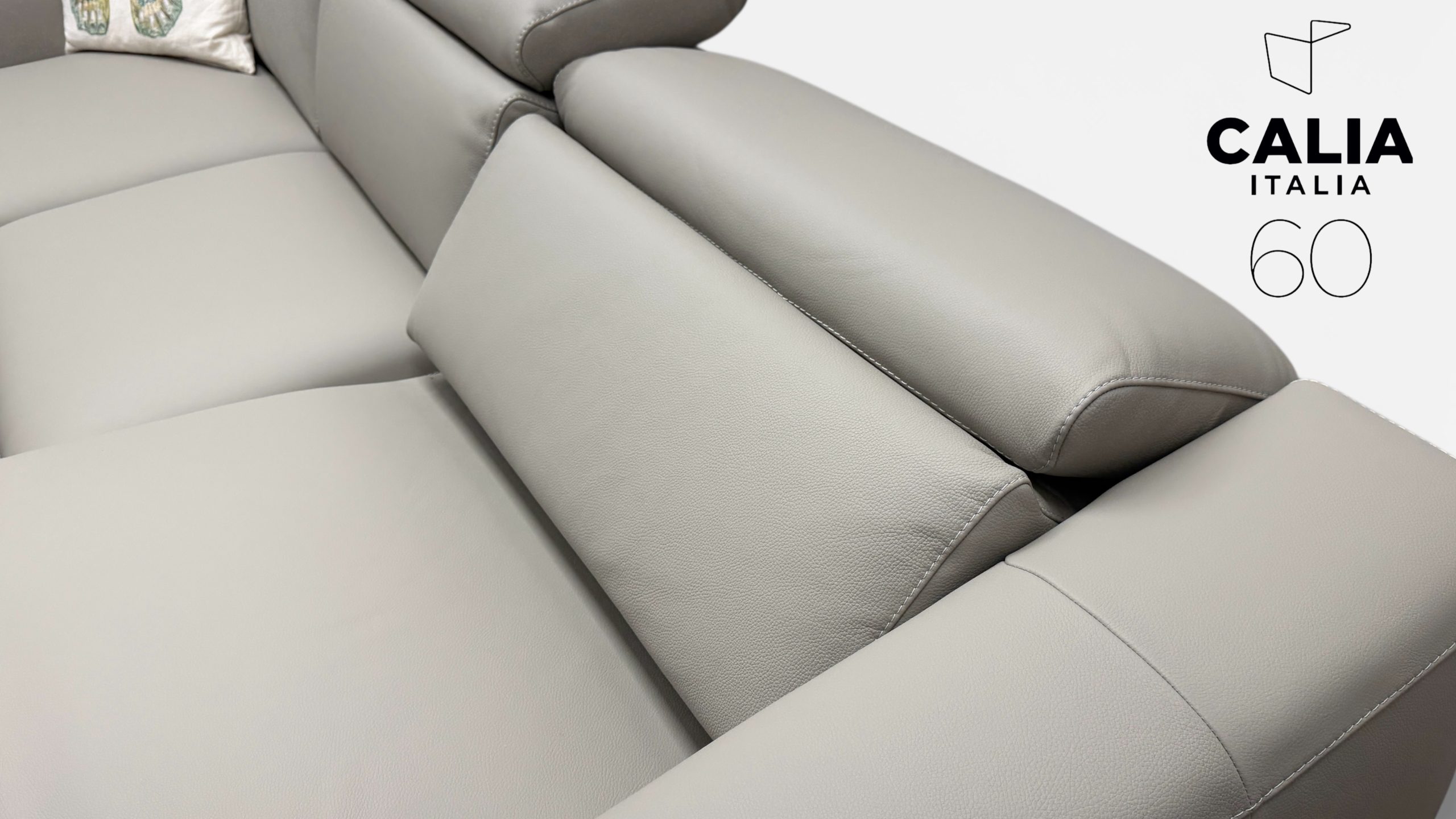 This listing is a Calia Italia Leysin leather suite with a chaise corner layout and motion comfort, built in Italy by Calia Italia. The configuration shown includes reclining functionality and powered headrests on the three seater, giving you a more supportive head and neck position when you lean back.