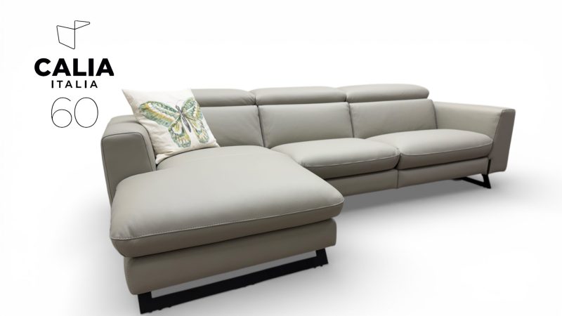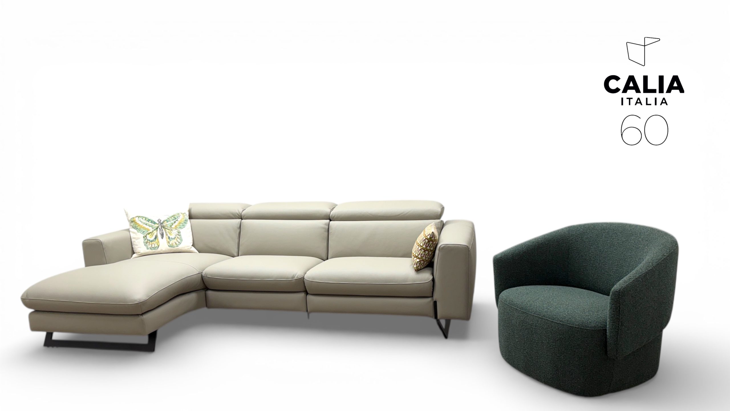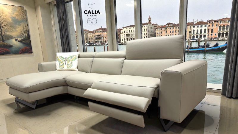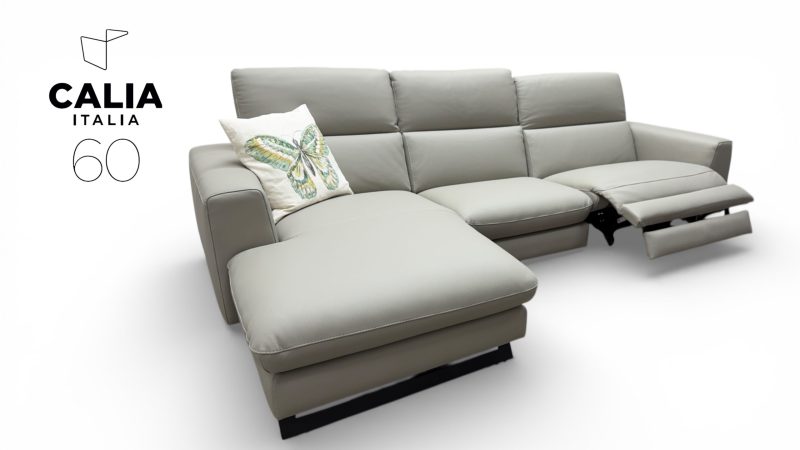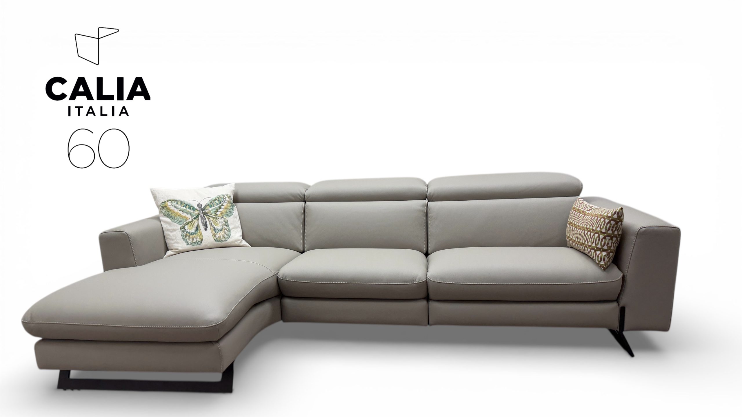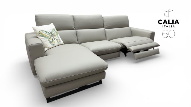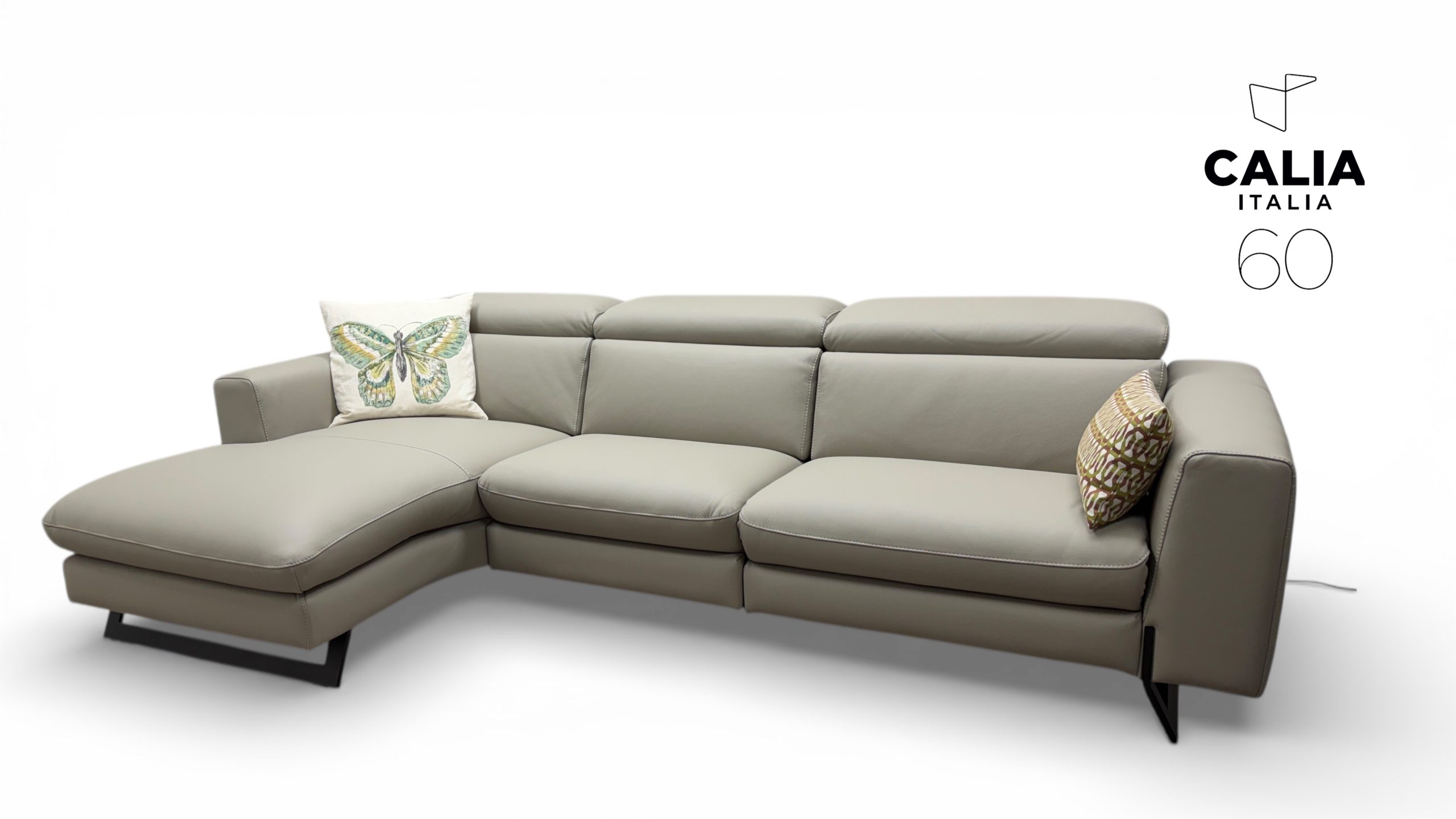 This listing is a Calia Italia Leysin leather suite with a chaise corner layout and motion comfort, built in Italy by Calia Italia. The configuration shown includes reclining functionality and powered headrests on the three seater, giving you a more supportive head and neck position when you lean back.