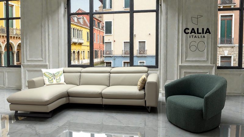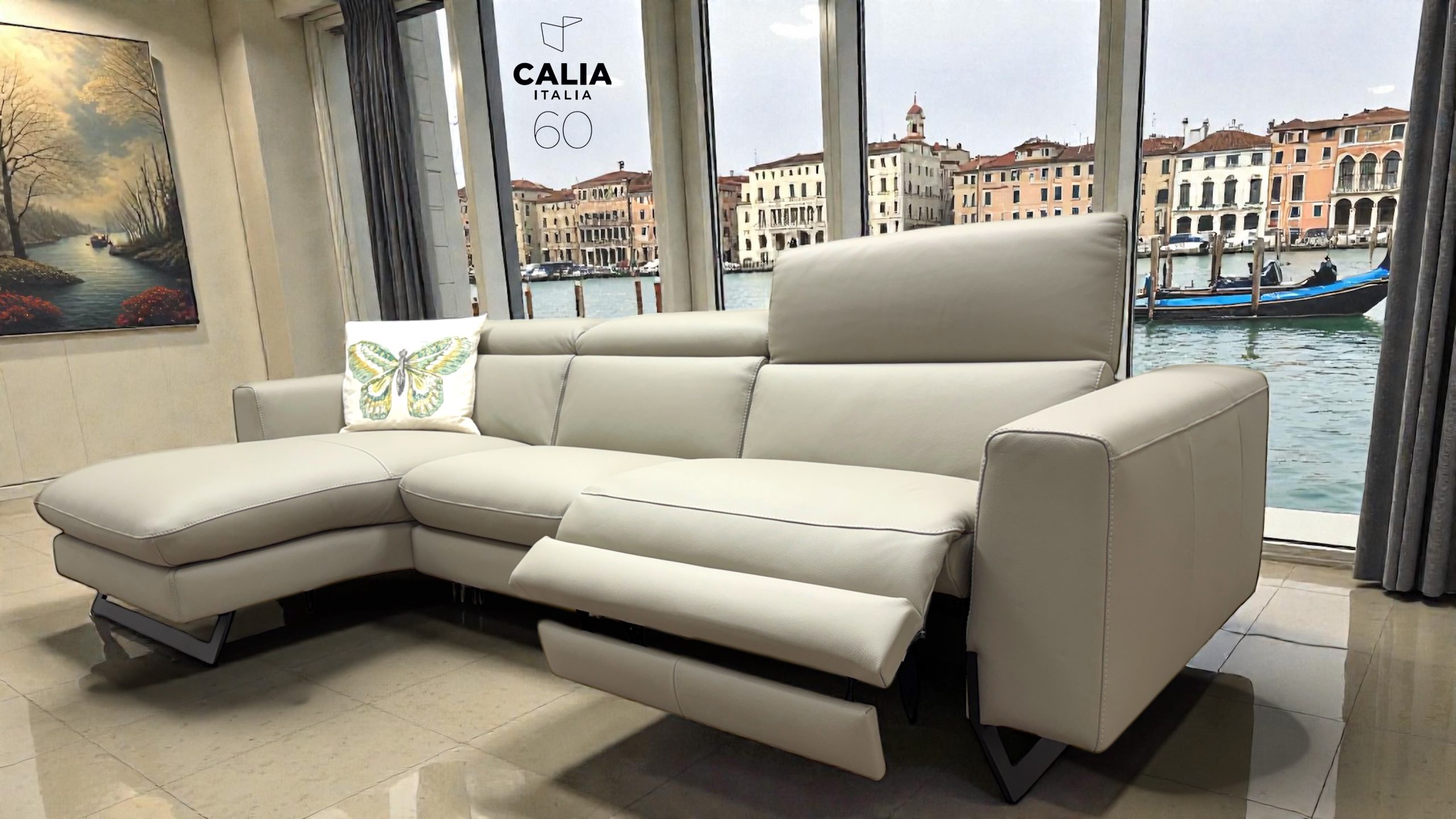 The Calia Italia Leysin is a brand new contemporary chaise corner sofa suite designed to look sharp, feel luxurious, and deliver proper reclining comfort in a clean Italian silhouette. This model stands out for its modern proportions, feature leg and front design, and a premium stone beige protector Italian leather finish that suits bright, modern interiors.