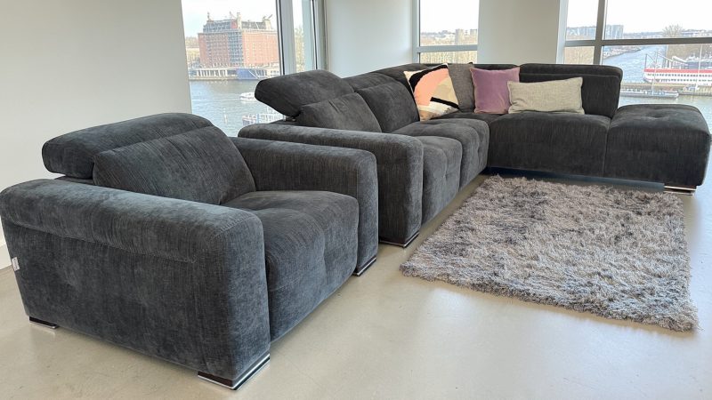 Discover a striking Italian designer corner sofa from Franco Ferri Italia, one of the more exclusive names in contemporary Italian upholstery. Made in Italy and finished in a rich charcoal grey chenille luxury fabric, this impressive corner sofa combines bold modern styling with deep comfort and superb lounge appeal.