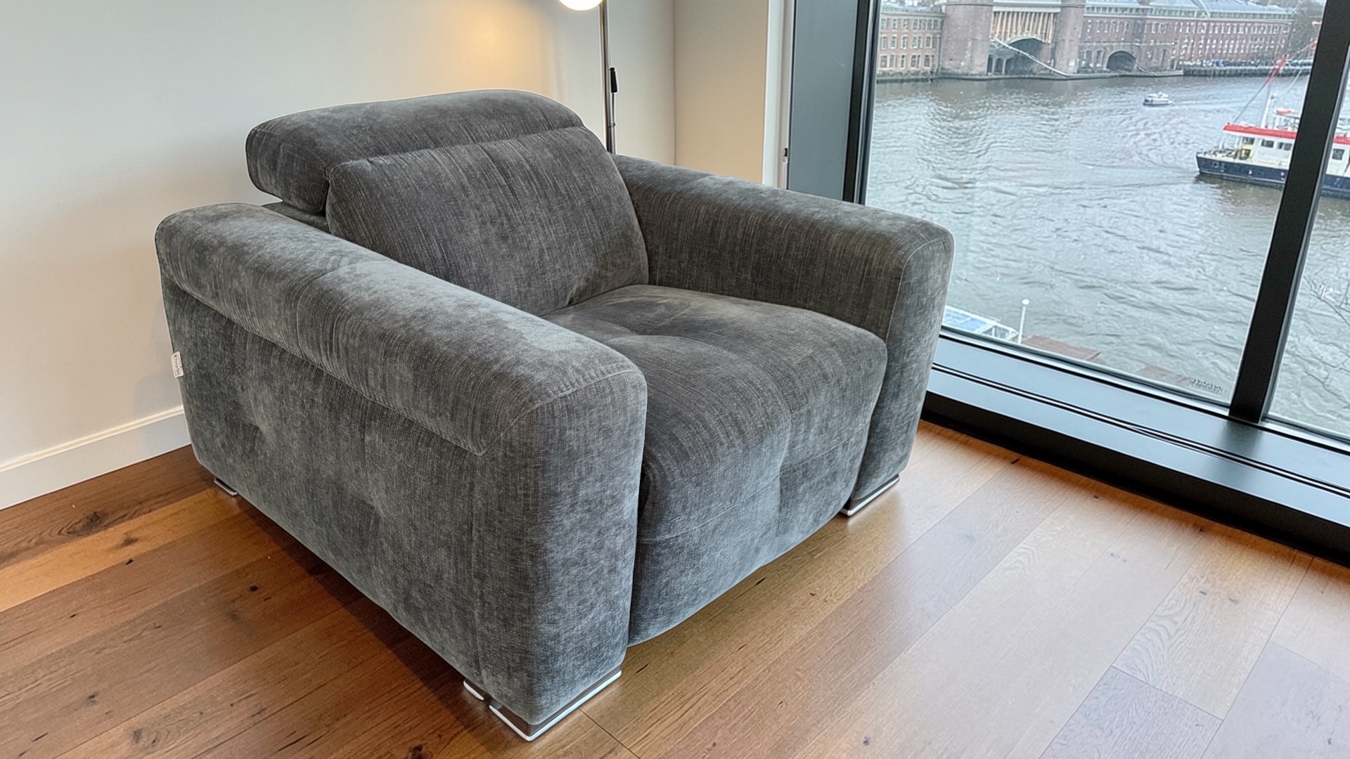 The design has a strong architectural look with generous proportions, wide low arms and a sleek contemporary profile. The arm seat features a power recliner and power headrest, giving you the option to sit back and relax at the touch of a button. It is a statement sofa that offers both designer looks and practical comfort for everyday living.