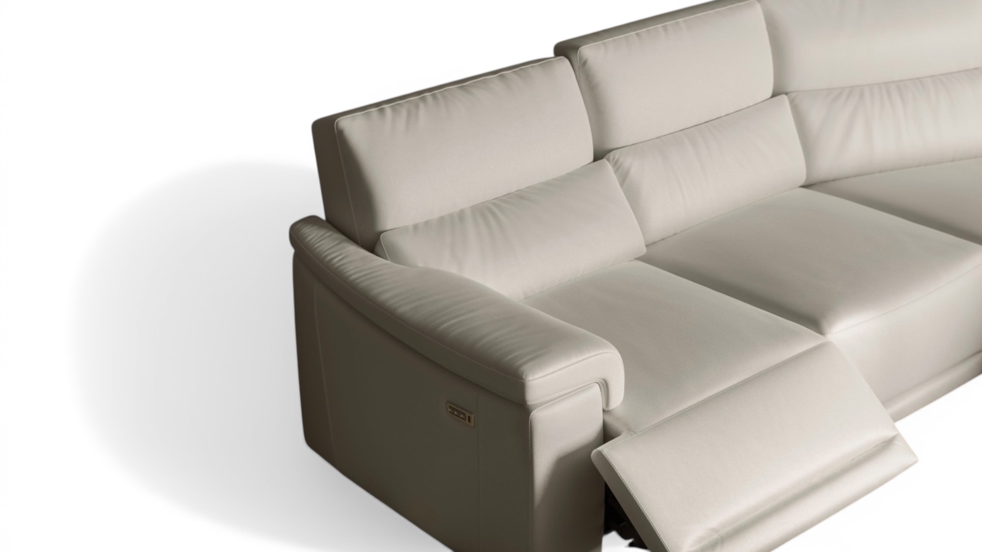 On this display corner, the power comfort functions are built into the right hand arm seat, giving you triple function motion at the touch of a button. Natuzzi’s official Brama brochure confirms Cubicomfort Triple Motion technology, with three independent electrically operated mechanisms that adjust the footrest, headrest and lumbar support, plus a built in USB port for convenient charging.