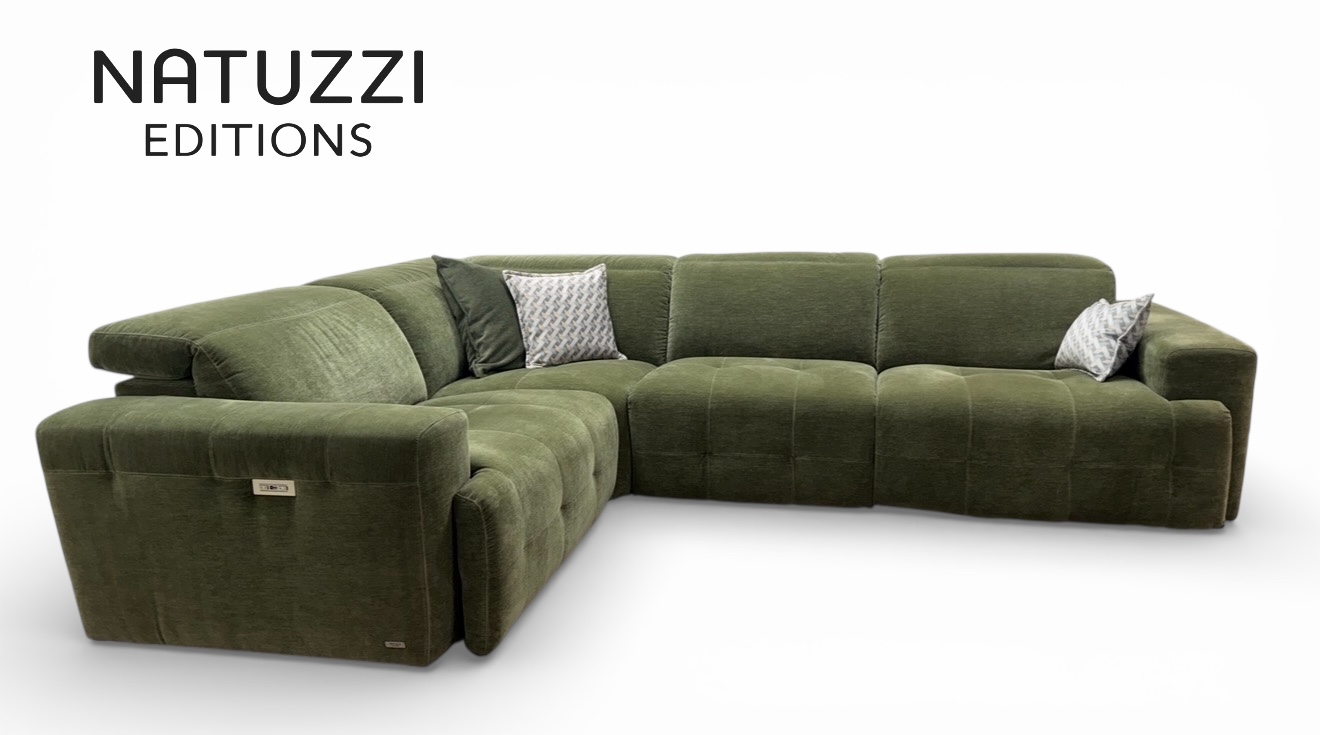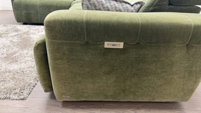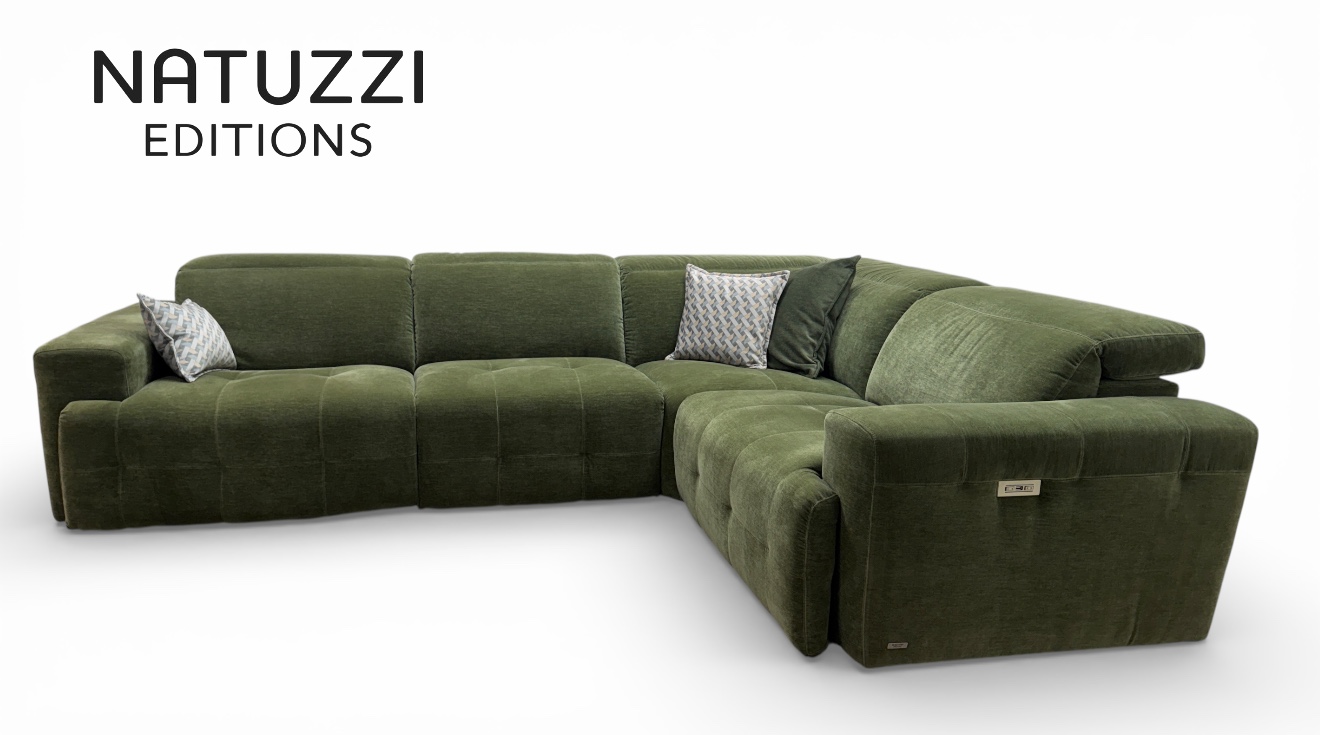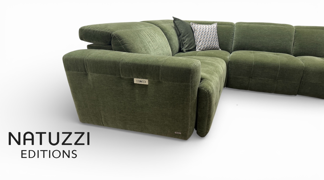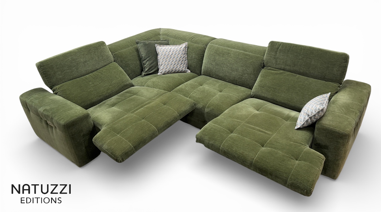 If you want a proper Natuzzi Clearance outlet deal on a high end modular corner sofa, this is the one to see in person. This is the Natuzzi Editions Intenso, model C157, an ex display corner group in a rich green, cleanable fabric, with power recliners and power headrests on both end seats.