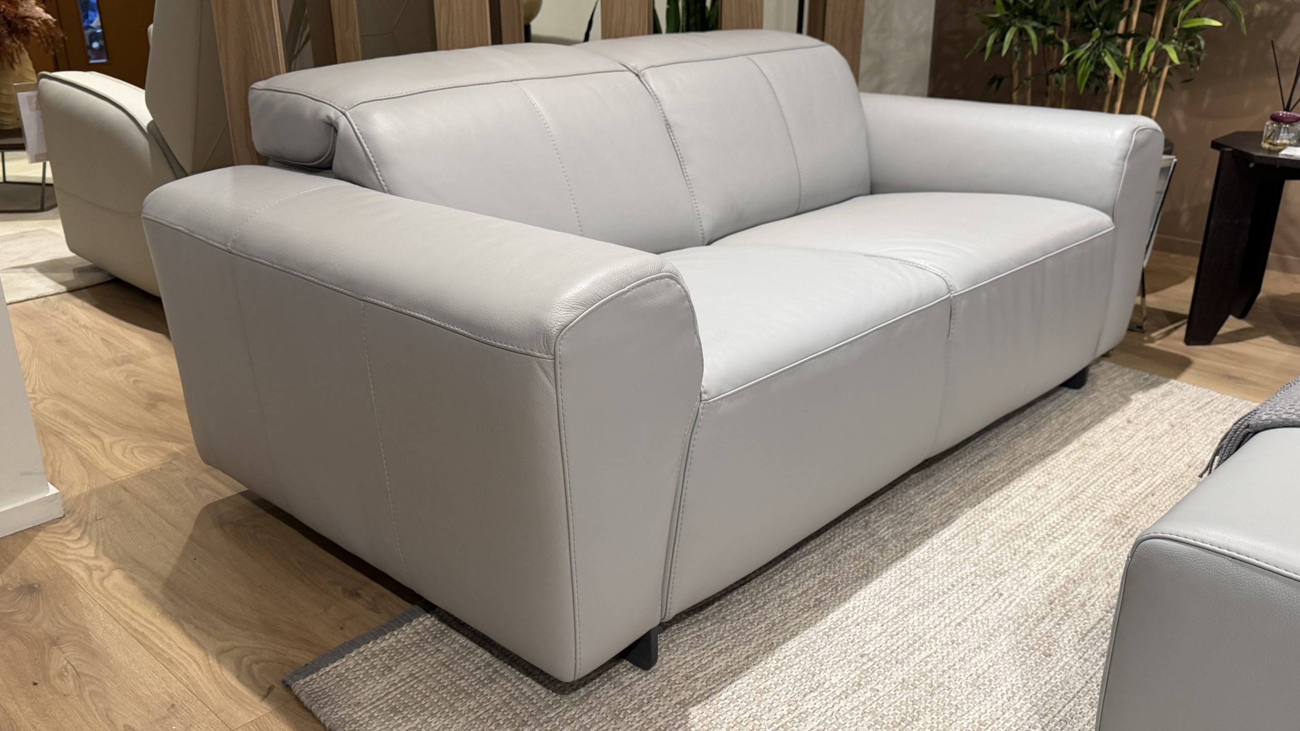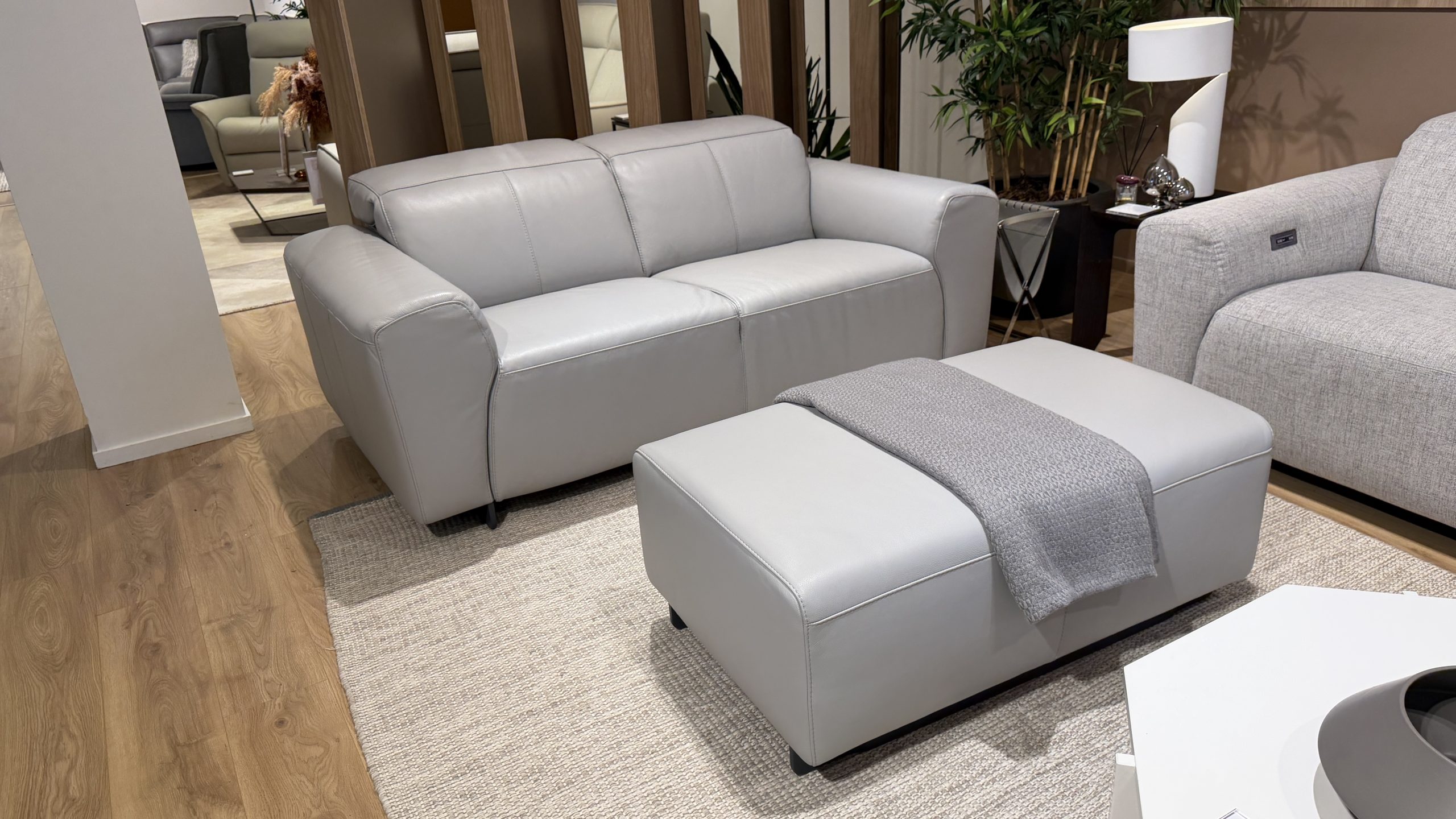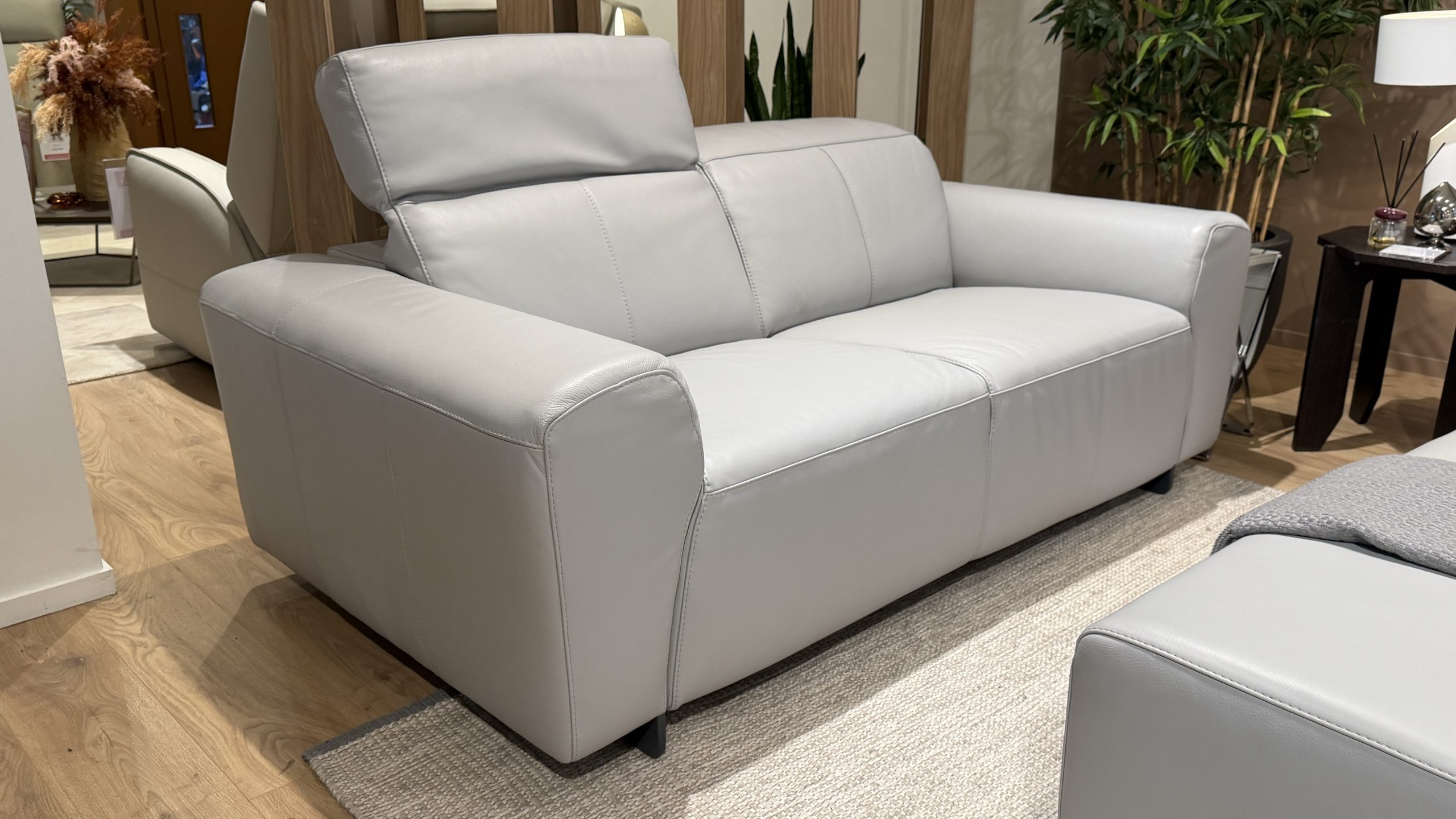If you are looking for a grey leather two seater sofa with a designer look, genuine Italian pedigree and a matching footstool, this Natuzzi Editions Modus is a very strong option. It suits modern apartments, smart lounges, garden rooms and open plan spaces where you want the sofa to look refined from every angle, not overstuffed or bulky.