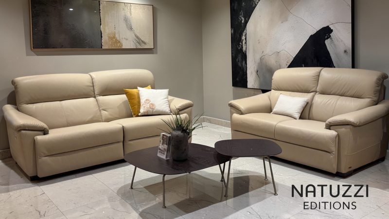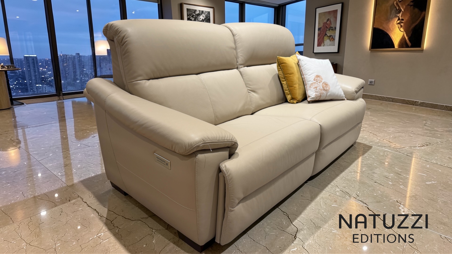 If you want a proper comfort first Natuzzi, Potenza is one of those models that makes sense the moment you sit down. This is the Natuzzi Editions Potenza, official model code C063, offered here as a matching set with a powered three seater and a coordinating static two seater, finished in a light taupe stone protected leather.