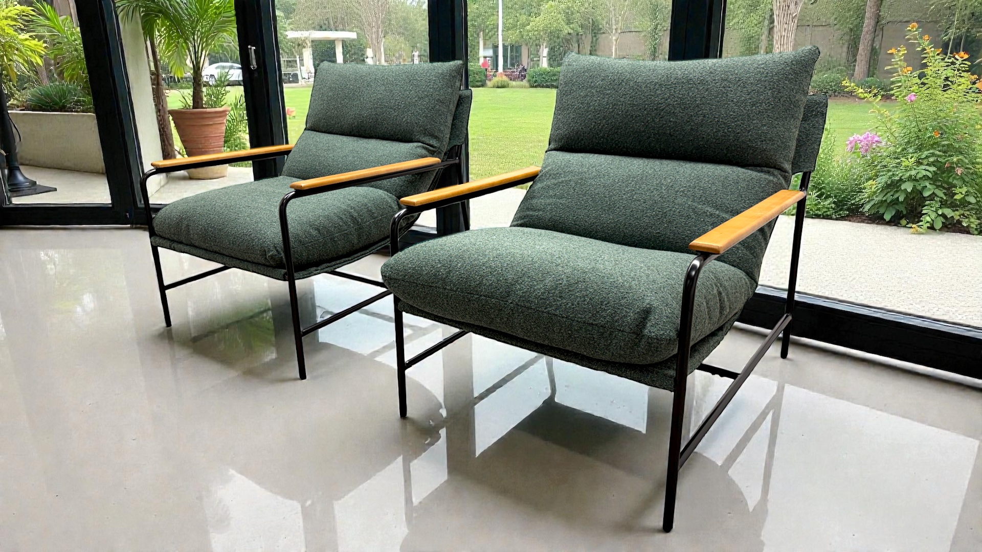 - Deep lounge seating with supportive curved backrest