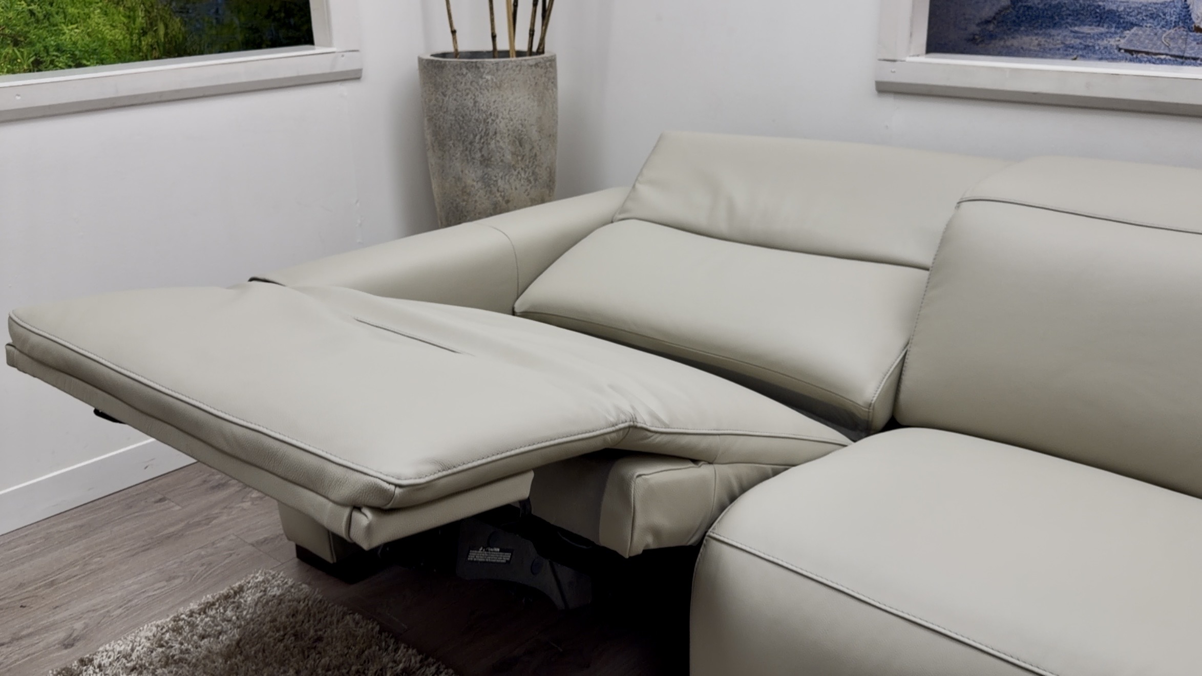 A: The power recliner is on the arm seat, designed to deliver proper relaxation while keeping the overall sofa look minimal.
