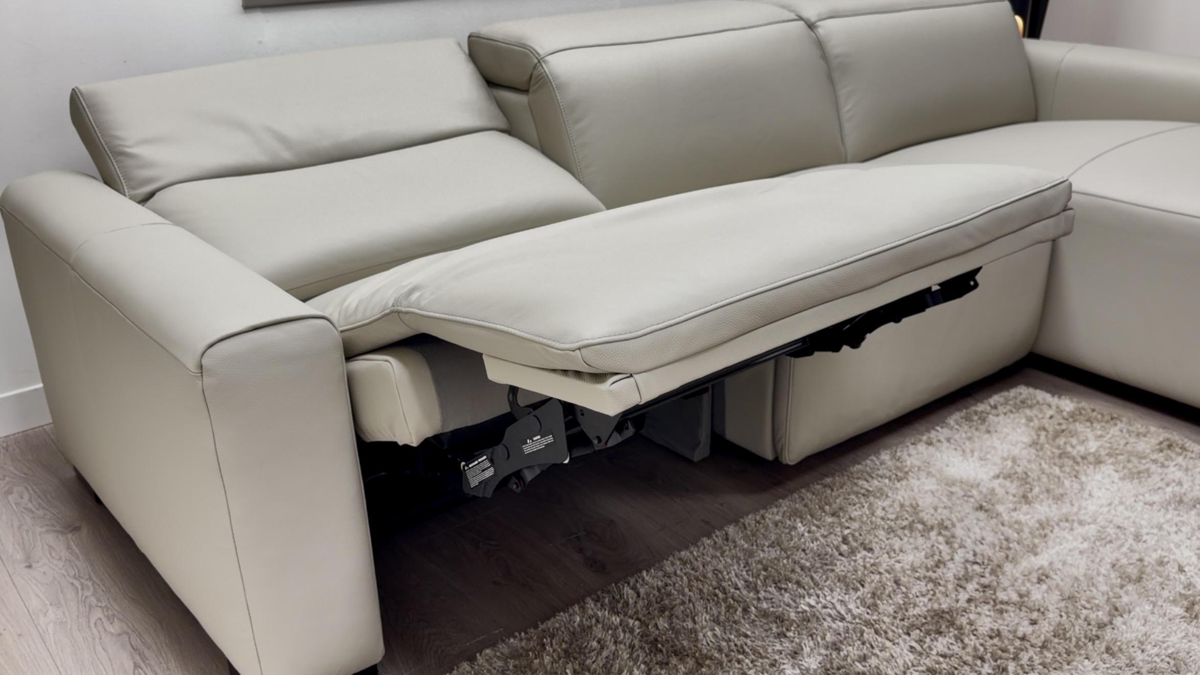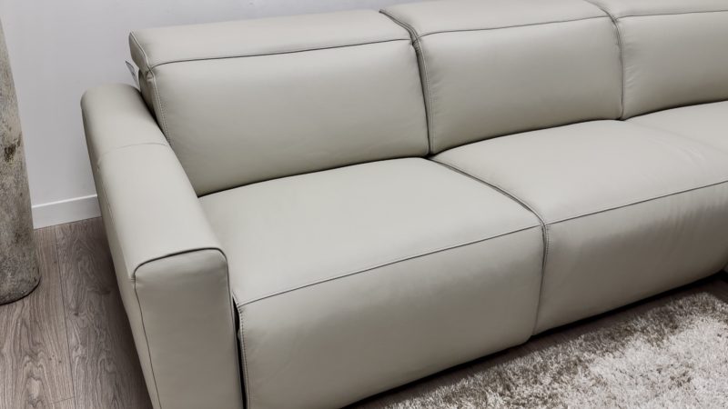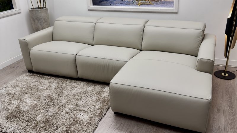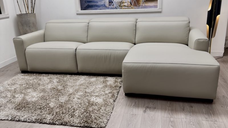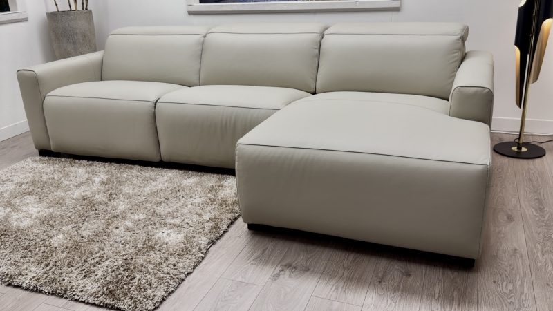 Meet the Volante Dolce, a clean, minimal leather chaise sofa designed for real everyday comfort. It keeps the look modern and uncluttered, but adds the comfort upgrades you actually use, including a power headrest and a power recliner on the arm seat.
