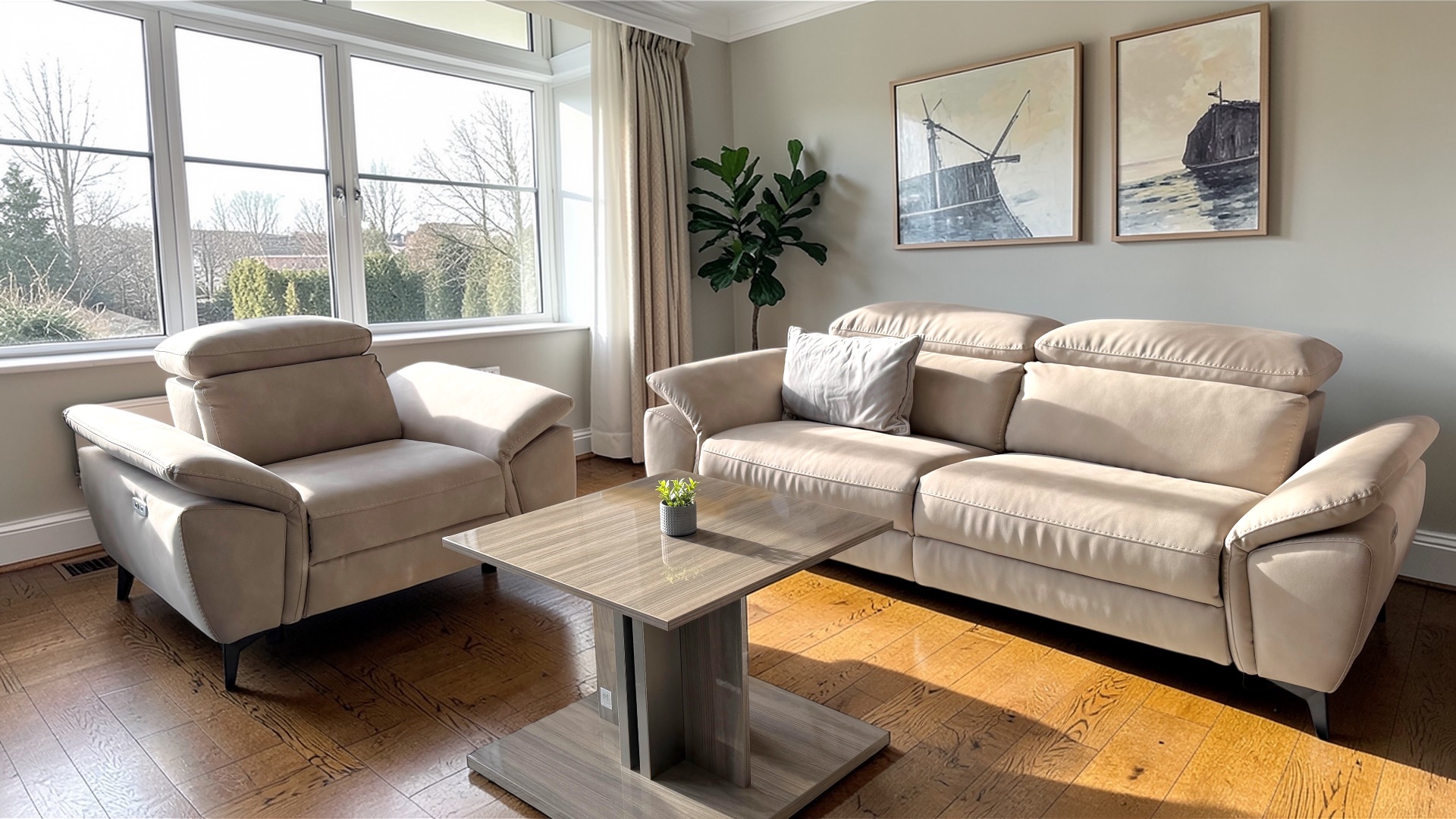 The first thing that stands out is the look. The Volante Elliott has a smart modern shape with generous arms, supportive seating and a clean low line profile that feels current and premium. The beige nubuk finish gives the suite a soft relaxed character that works beautifully with modern neutral interiors, wood flooring and light open plan spaces. It has that calm designer feel that makes a room look brighter, warmer and more refined.