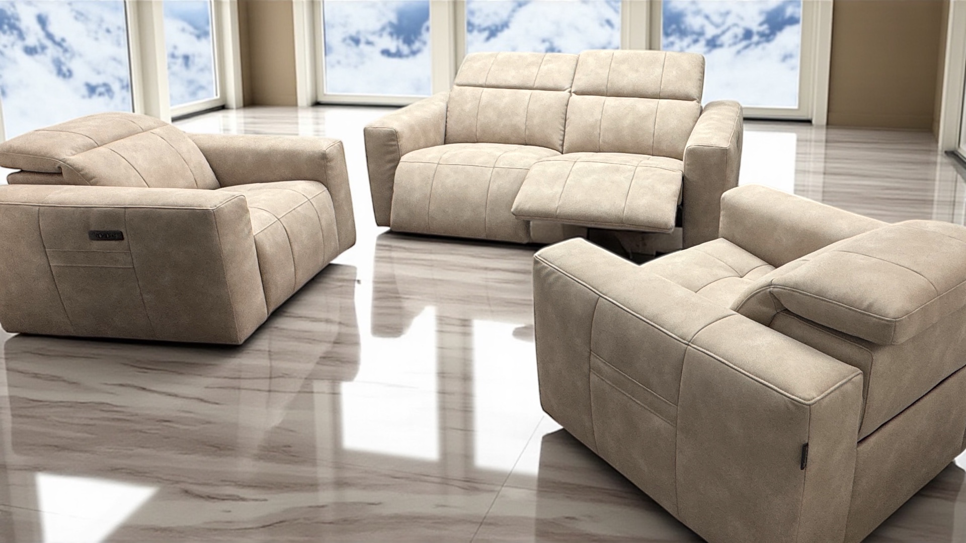 Each seat is designed for total comfort, with advanced multi-layer sprung interiors and precision-engineered motion systems that recline effortlessly at the touch of a button. The power headrests rise and tilt forward to support your neck and shoulders, making this one of the most comfortable suites on the market.