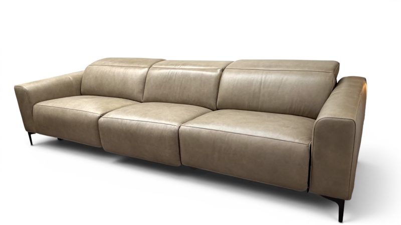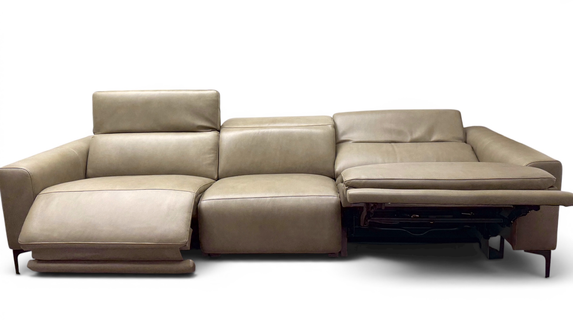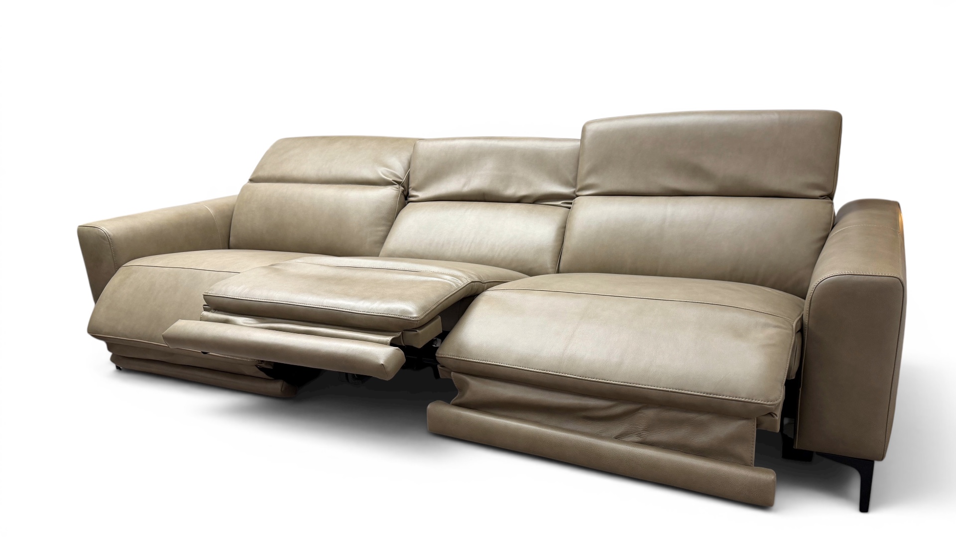 The Volante Maxim Taupe 4 Seater Triple Recliner gives you generous seating space, three powered recliners, zero gravity comfort, power headrests, premium leather, and a modern open base design in one impressive sofa.